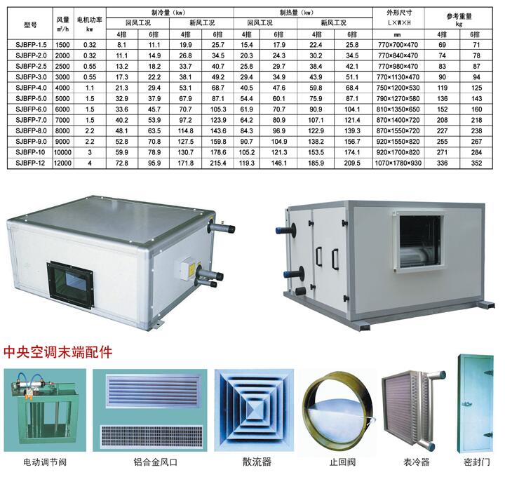 具有制冷供熱性能、噪聲低、構造緊湊、重量輕、裝置維護便當?shù)膬?yōu)點,臥式、立式、吊頂式等可供選擇,可根據(jù)實踐狀況選擇風量大小及機外余壓。