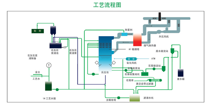 水制成吸收劑漿液。在吸收塔內,吸收漿液與煙氣觸混合,煙氣中的二氧化硫與漿液中的碳酸鈣以及鼓入的氧化空氣進行化學反應從而被