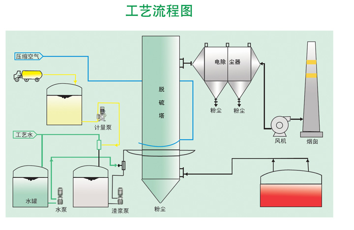 熱煙氣進入噴霧感受吸收塔后立即與被霧化的堿性脫硫漿液接觸Ca(OH2),煙氣中的酸性成分(HCI/HF/SO2/SO3)被堿性霧滴吸收的同時水份被蒸發(fā),變成堿性顆粒,煙氣分配的精確控制,脫硫漿液流量和霧滴尺寸的控制確保了霧滴被轉(zhuǎn)化成細小的粉體。一些飛灰和脫離渣從吸收塔底部排出。已經(jīng)處理的煙氣進入后續(xù)除塵器被去除剩余的懸浮顆粒。凈化后的煙氣通過煙囪排放。與此同時,吸收塔和除塵器底部排出的干燥粉體顆粒被傳送到料倉。